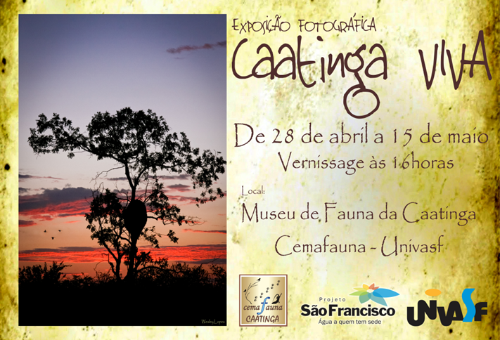 O Centro de Conservação e Manejo de Fauna da Caatinga (Cemafauna Caatinga) inaugurará na próxima terça-feira, 28, às 16h no Museu de Fauna a exposição 'Caatinga Viva' em comemoração ao Dia Nacional da Caatinga. São 40 fotografias de autoria de analistas ambientais e mateiros do Centro, realizadas durante suas atividades de campo em cidades com áreas sob influência do Projeto de Integração do Rio São Francisco (PISF). A mostra segue até o dia 15 de maio desse ano.