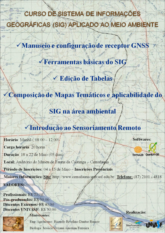 O curso apresentará com ênfase a avaliação do meio ambiente e recursos naturais a partir de bases de dados georreferenciados. É uma proposta do Cemafauna em parceria com o Colegiado de Ciências Biológicas. Seu principal objetivo é capacitar profissionais, docentes, técnicos e discentes que atuam na área ambiental. Os ministrantes são o engenheiro agrônomo Ricardo Ramos e a bióloga Viviane Amorim.