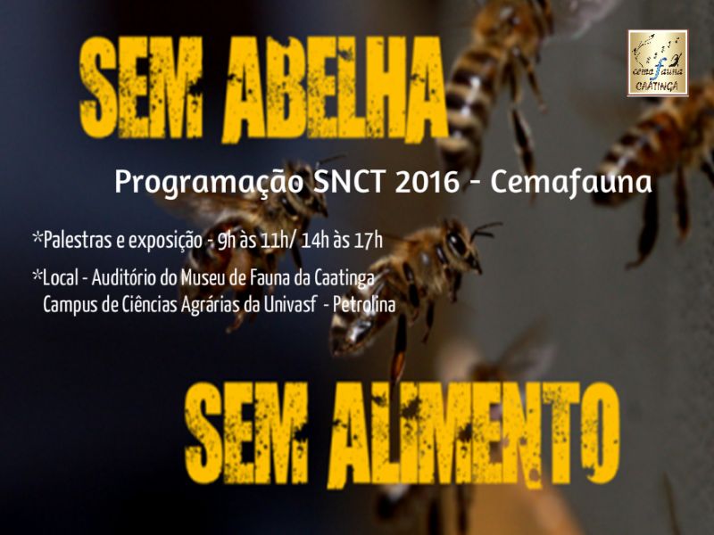 O Centro de Conservação e Manejo e Fauna da Caatinga (Cemafauna Caatinga), a partir dessa segunda (17), está com uma programação voltada para a 13ª edição da Semana Nacional de Ciência e Tecnologia 2016 (SNCT) cujo tema é “Ciência alimentando o Brasil”, sob a coordenação do Ministério da Ciência, Tecnologia, Inovações e Comunicações (MCTIC), por meio do Departamento de Difusão e Popularização da Ciência e Tecnologia (DEPDI/SECIS).