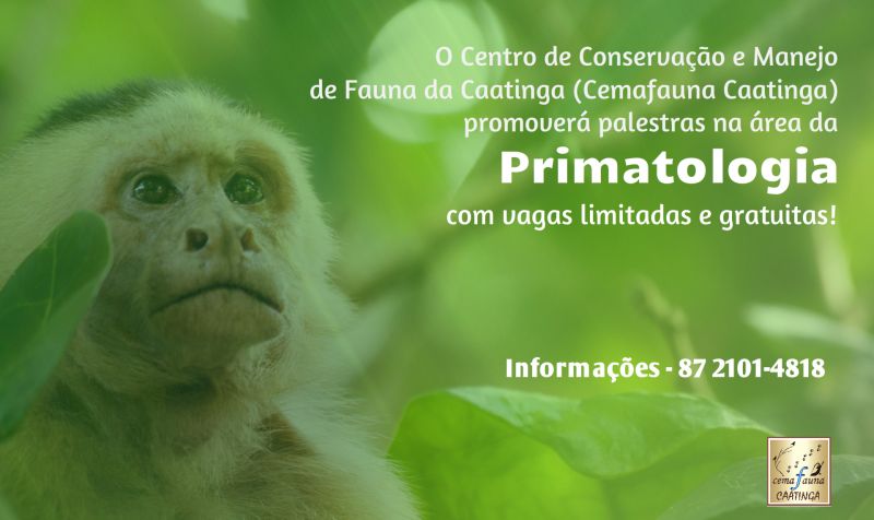 Nos dias 08 e 09 de dezembro desse ano, o Centro de Conservação e Manejo de Fauna da Caatinga (Cemafauna Caatinga) e o programa de Pós-graduação Ciências da Saúde e Biológicas da Universidade Federal do Vale do São Francisco promoverão palestras na área da Primatologia com vagas limitadas. A programação acontecerá no auditório do Museu de Fauna da Caatinga, no Cemafauna, que fica no Campus de Ciências Agrárias da Universidade Federal do Vale do São Francisco (Univasf), zona rural de Petrolina-PE.