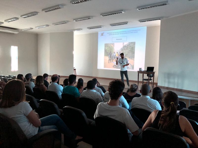 Thiago Filadelfo é biólogo formado na Universidade Federal da Bahia, com mestrado em Ecologia pela Universidade de Brasília. Sua formação acadêmica foi direcionada para a área ornitológica, com foco na biologia reprodutiva das aves. Colabora com o Projeto de Pesquisa e Conservação da Arara-azul-de-lear há 10 anos e, atualmente, está à frente da coordenação do Projeto de Soltura Experimental da Arara-azul-de-lear no Boqueirão da Onça. “Acho uma iniciativa muito louvável da instituição em proporcionar, aos estudantes no tempo da graduação, esse tipo de relato de pesquisas de fora da universidade. Vivenciar esse momento, trazer isso até estudantes, professores e profissionais das mais diversas áreas foi muito legal. Nós esperamos poder proporcionar opções de estágio, deixar aqui um pouquinho do que fazemos, nosso contato e firmar parcerias duradouras”, afirmou Filadelfo.