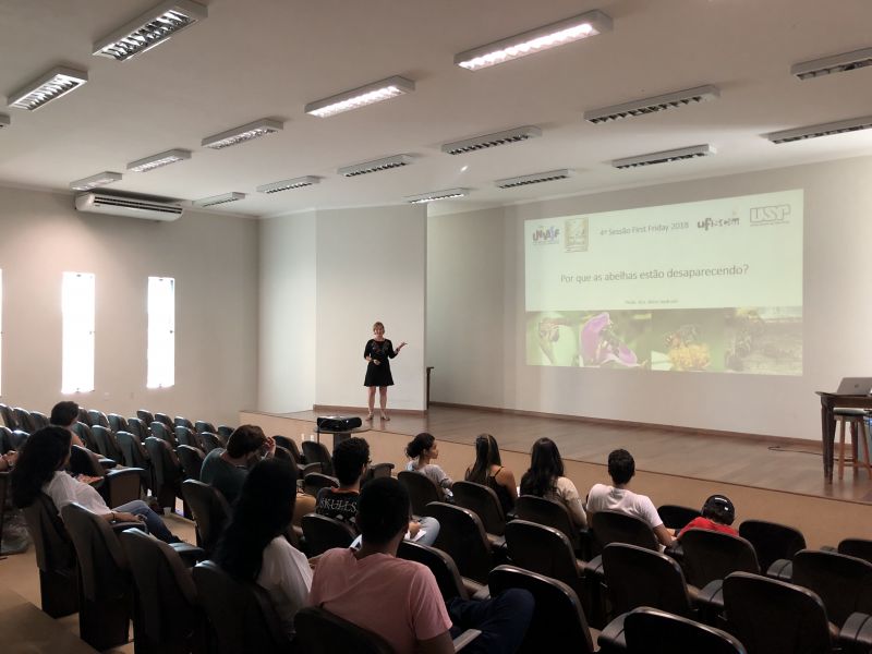 “Por que as abelhas estão desaparecendo?” foi o tema da quarta sessão do projeto científico-cultural 'First Friday', realizado pelo Centro de Conservação e Manejo de Fauna da Caatinga (Cemafauna Caatinga), situado no Campus de Ciências Agrárias da Universidade Federal do Vale do São Francisco (Univasf), em Petrolina-PE. No dia 04 de maio o auditório do Museu de Fauna da Caatinga recebeu estudantes, professores e profissionais da área da ecologia, biologia, medicina veterinária para discutir sobre o tema proposto ministrado pela ecóloga, pesquisadora/colaboradora do Laboratório de Entomologia do Cemafauna, Pós doutora em Genética e Evolução de Hymenoptera pela Universidade Federal de São Carlos, Aline Andrade.