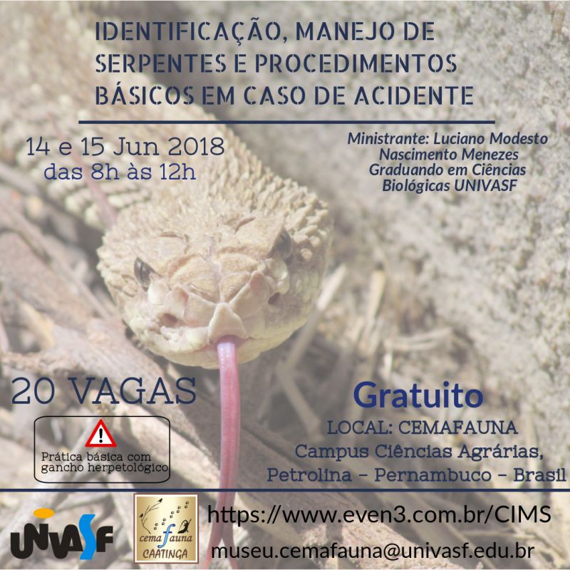O Centro de Conservação e Manejo de Fauna da Caatinga (Cemafauna Caatinga) abriu inscrições para curso sobre “Identificação, Manejo de serpentes e procedimentos em caso de acidente”, que acontecerá nos dias 14 e 15 de junho, na biblioteca do Museu de Fauna da Caatinga, Campus de Ciências Agrárias da Universidade Federal do Vale do São Francisco (Univasf), zona rural de Petrolina-PE. No total são oito horas de carga horária.