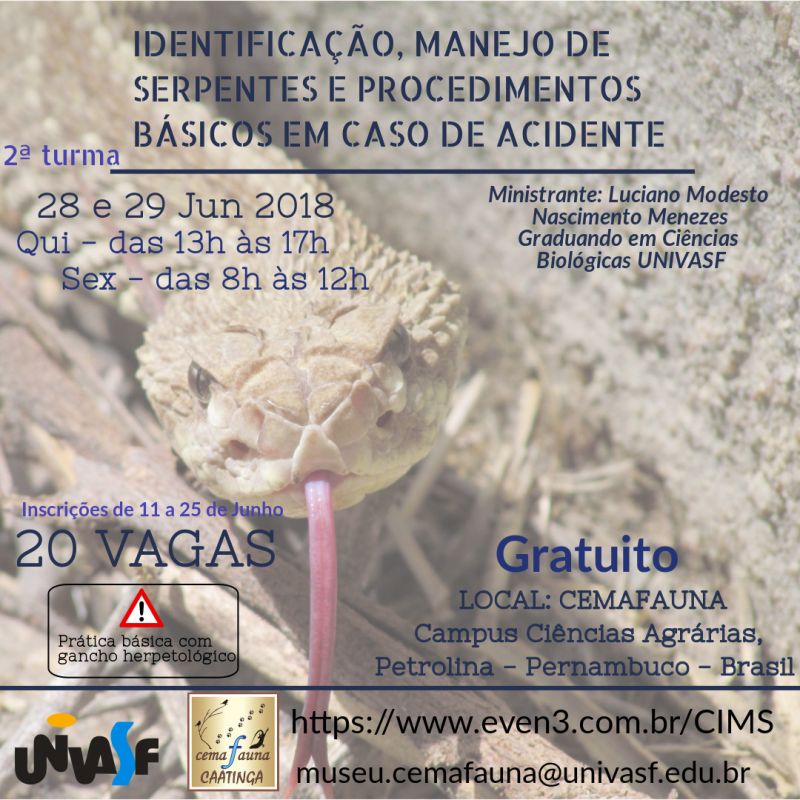 O Centro de Conservação e Manejo de Fauna da Caatinga (Cemafauna Caatinga) abriu inscrições para curso sobre “Identificação, Manejo de serpentes e procedimentos em caso de acidente”, que acontecerá nos dias 28 e 29 de junho, na biblioteca do Museu de Fauna da Caatinga, Campus de Ciências Agrárias da Universidade Federal do Vale do São Francisco (Univasf), zona rural de Petrolina-PE. No total são oito horas de carga horária.