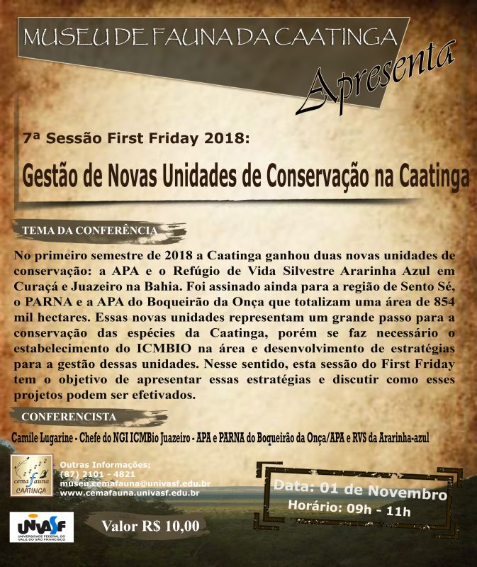 “Gestão de Novas Unidades de Conservação na Caatinga” é o tema da edição do First Friday que em novembro acontecerá, excepcionalmente, na quinta-feira, 01, devido ao feriado da sexta-feira, 02. O tema será ministrado pela médica veterinária e chefe do Núcleo de Gestão Integrada (NGI) do Instituto Chico Mendes de Conservação da Biodiversidade (ICMBio) em Juazeiro-BA, Camile Lugarini. O evento é promovido pelo Centro de Conservação e Manejo de Fauna da Caatinga e acontecerá às 9h, no auditório do Museu de Fauna da Caatinga situado no Campus de Ciências Agrárias da Universidade Federal do Vale do São Francisco (Univasf), em Petrolina-PE.