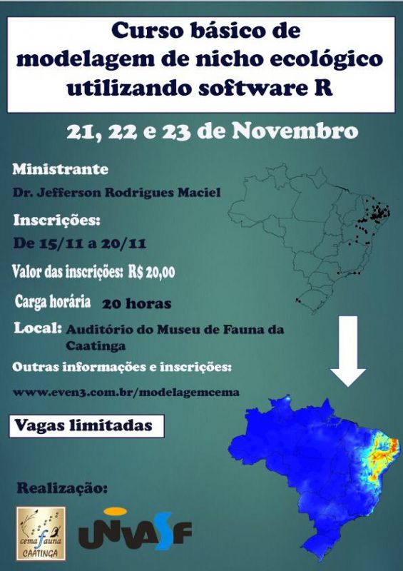 O Centro de Conservação e Manejo de Fauna da Caatinga (Cemafauna Caatinga) abre inscrições a partir do dia 15 até 20 de novembro para curso básico de modelagem de nicho ecológico utilizando software R a ser ministrado pelo doutor Jefferson Rodrigues Maciel, pesquisador do Jardim Botânico de Recife-PE. O curso ocorrerá de 21 a 23 de novembro o auditório do Museu de Fauna da Caatinga, Campus de Ciências Agrárias da Univasf, zona rural de Petrolina-PE.