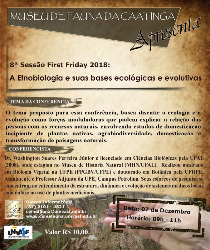 “A Etnobiologia e suas bases ecológicas e evolutivas” é o tema da última edição de 2018 do First Friday realizado pelo Centro de Conservação e Manejo de Fauna da Caatinga (Cemafauna Caatinga) na sexta-feira, 07 de dezembro. O tema terá como conferencista o professor doutor Washington Soares Ferreira Júnior do campus Petrolina da Universidade de Pernambuco (UPE). O evento é acontecerá às 9h, no auditório do Museu de Fauna da Caatinga situado no Campus de Ciências Agrárias da Universidade Federal do Vale do São Francisco (Univasf), em Petrolina-PE.