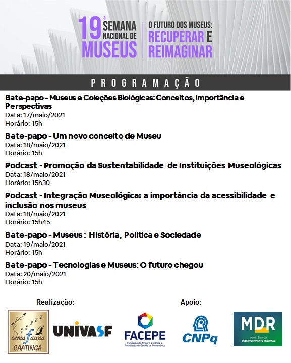 A realização do evento é uma das atividades do projeto do Centro de Conservação e Manejo de Fauna da Caatinga (CEMAFAUNA) que conta com o apoio da Fundação de Amparo à Ciência e Tecnologia do Estado de Pernambuco (FACEPE) através do Edital para o desenvolvimento da Ciência, Tecnologia e Inovação nos Museus de Pernambuco.