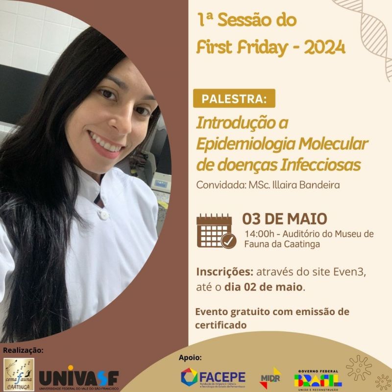 “Introdução a Epidemiologia Molecular de doenças Infecciosas” é o tema da 1ª edição do First Friday 2024. O tema será ministrado pela bióloga e pesquisadora do laboratório de Genética Molecular do CEMAFAUNA, MSc. Illaira Bandeira. O evento é promovido pelo Centro de Conservação e Manejo de Fauna da Caatinga e acontecerá às 14h, no auditório do Museu de Fauna da Caatinga situado no Campus de Ciências Agrárias da Universidade Federal do Vale do São Francisco (Univasf), em Petrolina-PE.