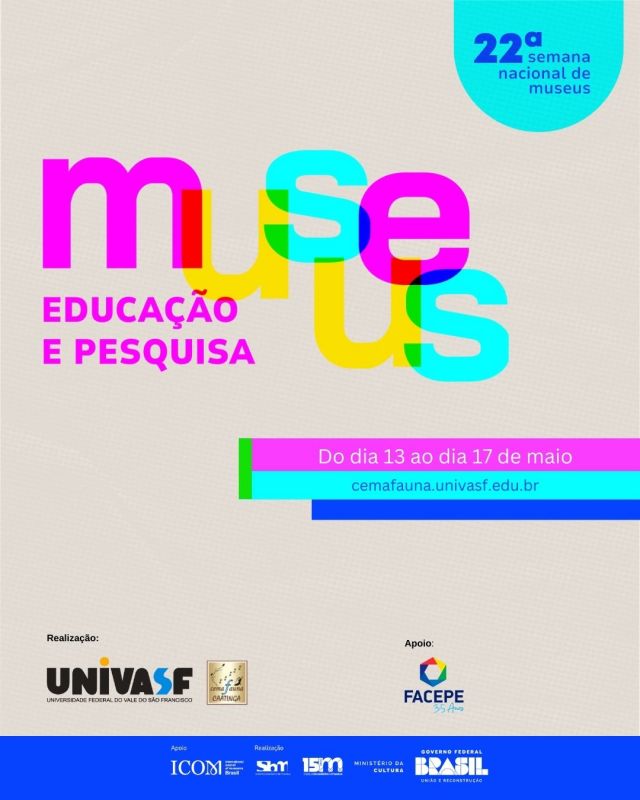 Celebrando a 22ª Semana Nacional de Museus, o Museu de Fauna da Caatinga traz uma programação especial em parceria com a Facepe, em sintonia com o tema: 'Museus, Educação e Pesquisa' proposto pelo Conselho Internacional de Museus (ICOM). Confira nossas atividades: