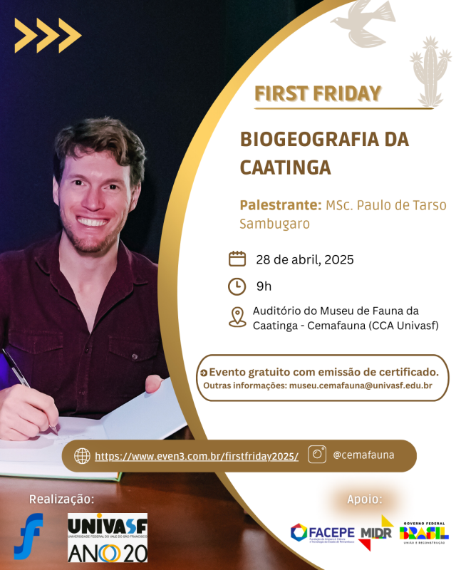 O First Friday é um evento mensal e gratuito promovido pelo Museu de Fauna da Caatinga, que propõe discutir de forma leve e acessível temas ligados ao bioma Caatinga. A iniciativa busca aproximar a ciência do dia a dia das pessoas, criando um espaço de troca, aprendizado e reflexão. As inscrições são feitas pela plataforma Even3 e dão direito a certificado. Nesta edição especial, em homenagem ao Dia da Caatinga, o Cemafauna reafirma seu compromisso com a valorização do bioma e a educação ambiental. Mais do que compartilhar conhecimento, o evento convida a sociedade a olhar com mais atenção e cuidado para a nossa Caatinga — um patrimônio natural único e essencial.