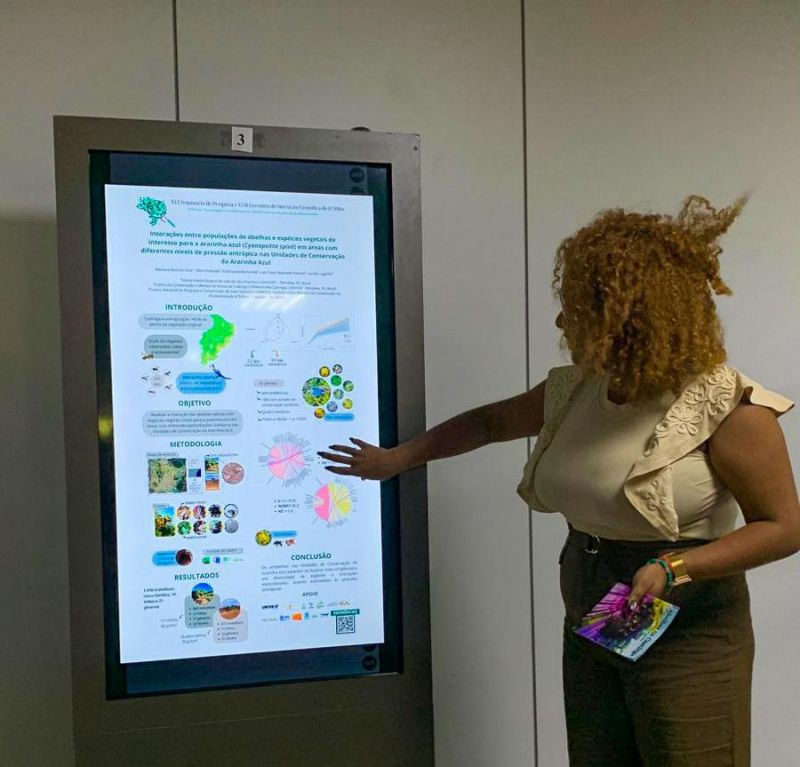Representando o Cemafauna, vinculado à Universidade Federal do Vale do São Francisco (Univasf), participaram a pesquisadora Aline Andrade e os bolsistas Mariana Barroso Cruz e Ludwig Lima Nunes, orientados por ela no âmbito da parceria entre ICMBio e Cemafauna-Univasf. Os trabalhos apresentados abordam estudos voltados à ecologia da conservação, comportamento e sustentabilidade das abelhas nativas, com foco nas Unidades de Conservação da Ararinha-azul e do Boqueirão da Onça, ambas localizadas no estado da Bahia. Os dois estudos integram o esforço científico em compreender os efeitos das modificações humanas sobre as populações de abelhas, consideradas espécies-chave na manutenção da biodiversidade. As pesquisas revelam como as mudanças no uso do solo, a perda de vegetação e a pressão antrópica interferem nas redes de interação entre abelhas e plantas nativas, impactando diretamente os ecossistemas da Caatinga.